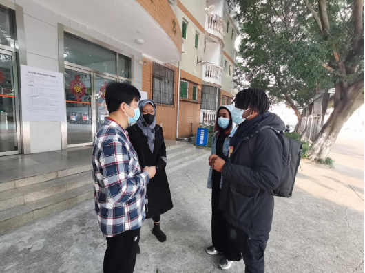 国际教育学院余元玲院长和汪贵平、周慧敏等驻校值守老师下沉一线,走访留学生宿舍,积极与学生沟通交流,了解留学生迫切需求,积极协调解决留学生生活和学习中遇到的困难。汪贵平老师作为一名即将退休的老职工,在学院紧急调度时毅然回到校园,克服种种困难坚持值守。学院还积极与后勤公司、信息中心等部门对接,解决了留学生生活及学习的后顾之忧。