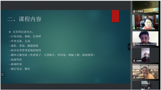 为丰富疫情期间留学生们的课余生活,学院开通了公益实用汉语在线课程,通过讲授日常用语和场景用语,为留学生就医、购物、兑换货币、学籍系统操作等方面提供帮助,让留学生们增强汉语运用能力,更加直观地了解中国文化,更好地适应在华留学生活。