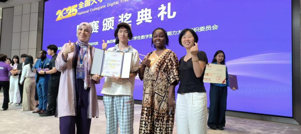 本次参赛团队中,留学生队员以多元背景和专业素养为团队赋能。国际经济与贸易专业(全英文)专业留学生白石(MARWA CHOULLI)、南桥(AYA EL FARSSI)凭借对国际贸易规则的专业理解,在跨境电商模拟环节中结合“丝路电商”区域特色设计了合规且高效的贸易方案;汉语国际教育专业研究生罗小杉(LOKO OLUWADUROTIMI EMILIENNE)则发挥语言与文化传播专长,在“中国文化与世界连接及传承”环节中,以国际化表达解读中国文化内涵,搭建起数字贸易与文化交流的桥梁,让赛事评审看到数字贸易背后的文化价值,成为团队的特色亮点。