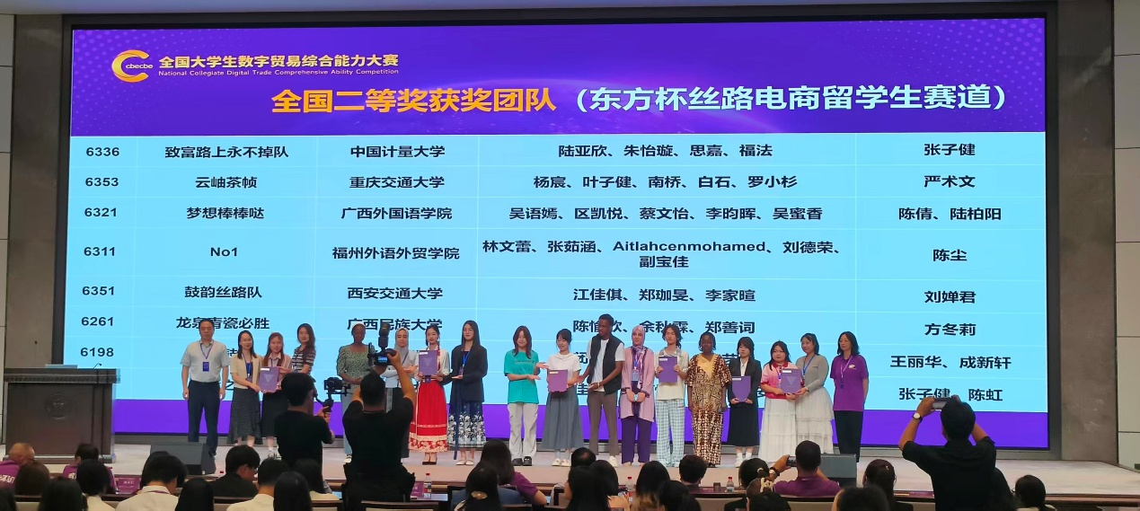 2025年9月27日,2025年第四届全国大学生数字贸易综合能力大赛、丝路电商来华留学生创新创业大赛暨东方杯“我为家乡代言”(国际组)全国总决赛在中国计量大学圆满落幕。本次大赛由浙江大学中国数字贸易研究院主办。大赛自启动以来,共有全国高校及国际团队提交的千余份初赛短视频作品参与,经过激烈角逐,40余支队伍进入决赛。国际教育学院精心组织3名优秀留学生与2名中国学生一起组建起了国际跨学科团队,在经济与管理学院严术文老师的指导下,凭借扎实的专业能力、鲜明的国际化视角及出色的协作表现,最终斩获全国二等奖。