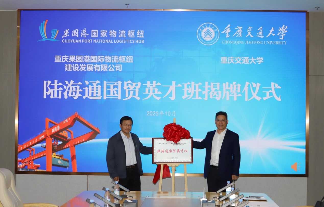 仪式现场气氛热烈,重庆保税港区集团领导梅时雨与重庆交通大学副校长罗均共同为“陆海通国贸英才班”揭牌。重庆交通大学副校长罗均在签约仪式上表示:“学校始终全面落实立德树人根本任务,致力于为学生搭建多元化实践教育平台,推进‘多元协同’育人模式改革。此次与果园港枢纽公司的合作,是双方优势互补、共谋发展的必然选择。学校将充分发挥自身在师资、学生培养和科研成果方面的优势,与果园港国家物流枢纽丰富的场景、鲜活的案例和国际化的标准深度融合,共同打造长江上游港航物流领域的产教融合标杆。”