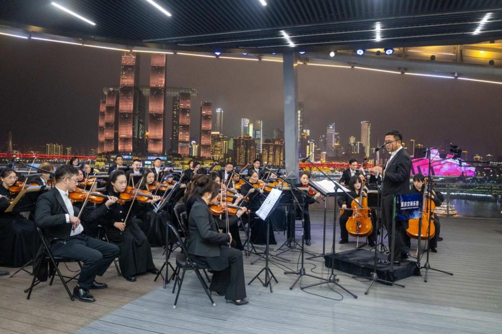 音乐会由重庆交响乐团著名指挥家郭修武先生执棒,精心打造了一场跨越东西方的“音乐环球旅行”。演出既有东方经典《太阳出来喜洋洋》、《我爱你中华》、《那片红叶》,也有西方音乐巨匠施特劳斯和巴赫的经典曲目。这场音乐的交融,让重庆的地域风情、中国的赤子情怀与世界的经典韵律在同一舞台温柔合奏。值得一提的是,音乐会创新性地与“新韵重庆”无人机灯光秀深度融合,打造“先闻乐声悠扬,再观星汉灿烂”的沉浸式体验,让中外学子在感受交响魅力的同时,直观领略“雄奇山水・新韵重庆”的城市活力与时尚风采。