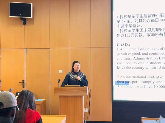 本次宣讲结合国际学生在华学习生活的实际场景,围绕治安管理、签证居留、交通出行、宗教活动、兼职实习、公共卫生、租房登记、学术诚信、安全防范、文化尊重等核心内容,结合真实案例开展普法引导。重点讲解了《中华人民共和国出境入境管理法》《道路交通安全法》等相关要求和不当行为可能产生的影响,帮助学生建立清晰的行为认知。