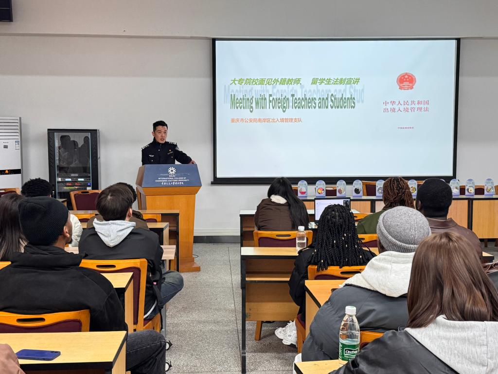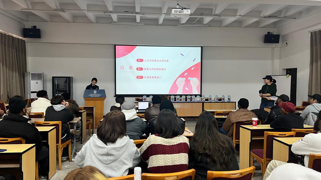 为进一步提升我校留学生的法治意识与禁毒认知,筑牢校园安全防线,3 月 19 日下午,重庆市南岸区出入境管理支队走进重庆交通大学,为在校留学生开展了一场主题鲜明、内容详实的禁毒与法制宣讲会。