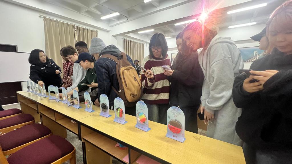 为让留学生更直观地认识毒品,宣讲会设置了警示样品展示与“面对面”科普环节。工作人员将各类毒品样本整齐陈列,让留学生近距离观察、辨别不同毒品的外观特征,并用通俗易懂的语言讲解其成分与危害。民警们还针对留学生关心的签证延期、法律责任等问题进行了一对一解答,帮助留学生清晰理解中国法律要求,强化守法意识。现场互动氛围热烈,留学生们主动提问、拍照记录,在直观感受与深入交流中深化对毒品危害的认知,增强防毒拒毒与遵纪守法的自觉意识。