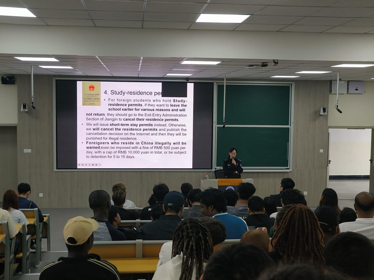 4月10日,由国际教育学院联合江津区公安局出入境管理支队、重庆国际旅行卫生保健中心共同举办的2026年国际学生法制安全宣讲会在我校科学城校区顺利举行。宣讲会聚焦签证合规、国门生物安全、校园纪律三大主题,为国际学生带来了一场实用性强、内容详实的安全教育讲座,护航国际学生在华平安求学路。