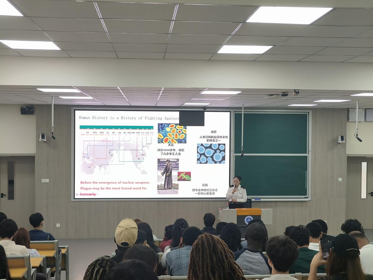 重庆国际旅行卫生保健中心张朓主任则围绕国门生物安全进行了专题讲解。他结合真实案例与图文资料,详细阐释了出入境动植物检疫规定,明确禁止携带活体动植物、生鲜食品、种子种苗等物品的具体要求,并深刻剖析了外来物种入侵对生态环境的巨大危害。张主任呼吁国际学生自觉遵守检疫法规,共同守护生态安全。